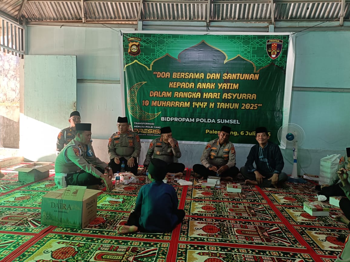 Palembang, tintamerah.co.id – Dalam rangka memperingati 10 Muharam 1447 Hijriah, Bidang Profesi dan Pengamanan (Bidpropam) Polda Sumsel gelar Gelar santunan anak yatim dan doa bersama di Panti Asuhan Abdi Bersama jalan Kolonel Sulaiman Amin Karya Baru Palembang Minggu 6 Juli 2025 sore