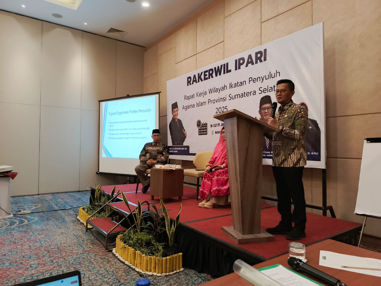 Kakanwil Kemenag Sumsel H. Syafitri Irwan membuka rapat kerja wilayah (Rakerwil) Ikatan Penyuluh Agama Republik Indonesia (IPARI) Provinsi Sumsel di Parkside’s Hotel Palembang, Rabu (17/07/2025). Pada kesempatan tersebut, Kakanwil menegaskan penyuluh agama memiliki tanggung jawab besar dalam menyebarkan nilai-nilai keagamaan yang damai dan rahmatan lil alamin.