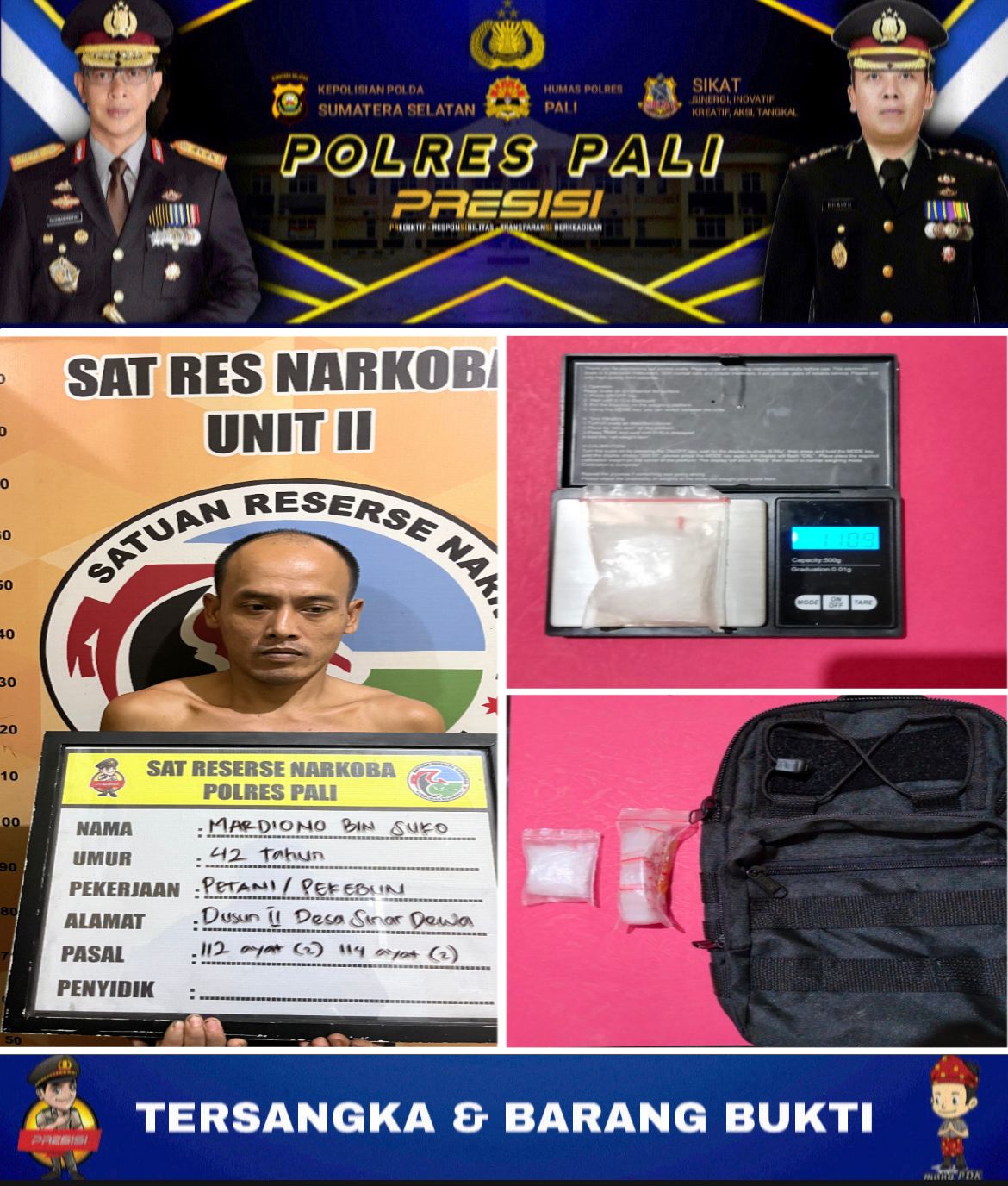 Hal ini dibuktikan setelah Satuan Reserse Narkoba Polres PALI menggerebek dan mengamankan seorang pria berinisial MD (41), yang diduga sebagai pelaku bandar sekaligus pengedar narkoba jenis sabu-sabu pada Senin (15/01/2024).
