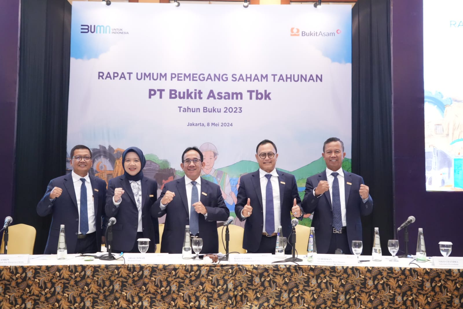 PT Bukit Asam Tbk (PTBA) | Tintamerah.co.id -Anggota Holding Grup MIND ID, menggelar Rapat Umum Pemegang Saham Tahunan (RUPST) untuk Tahun Buku 2023 di Jakarta, Rabu (8/5/2024). Dalam RUPST ini, pemegang saham menyetujui penggunaan 75 persen laba bersih Perseroan tahun 2023 sebesar Rp 4,6 triliun sebagai dividen.