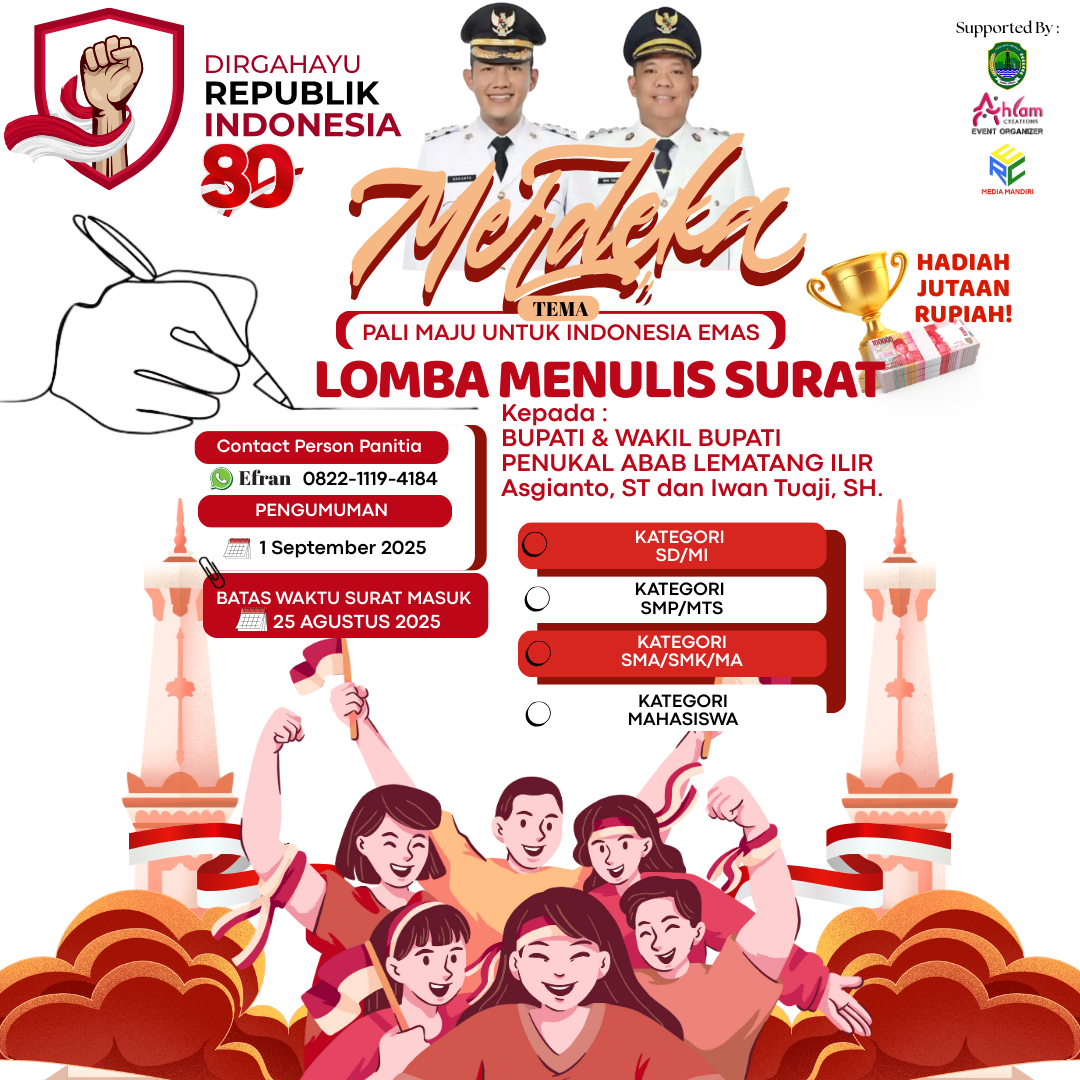 PALI | Tintamerah.co.id -, Dalam rangka memeriahkan Hari Ulang Tahun Kemerdekaan RI Ke – 80, Event Organizer (EO) Ahlam Creation menggelar lomba menulis kepada Bupati dan Wakil Bupati Penukal Abab Lematang Ilir (PALI).