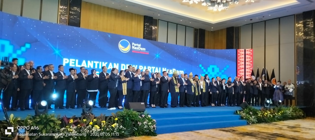 Palembang, tintamerah.co.id -Ketua Umum DPP NasDem H. Surya Paloh resmi melantik jajaran Pengurus , Dewan Pertimbangan, Dewan Pakar, Sayap dan Badan Partai DPW Nasdem Sumatera Selatan (Sumsel) periode 2025-2029 , Sabtu (5/7/2025) di Hotel Santika Bandara Palembang.