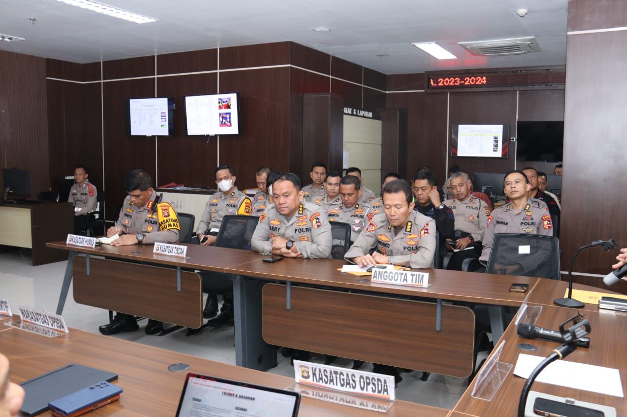 Tim yang diketuai Karojianstra Sops Polri Brigjen Marsudianto menggelar pertemuan dengan perangkat operasi ketupat Musi polda Sumsel dan jajaran diruang Pusat Pengendalian Operasi (Pusdalops), Mapolda Sumsel Jumat (5/4/2024)